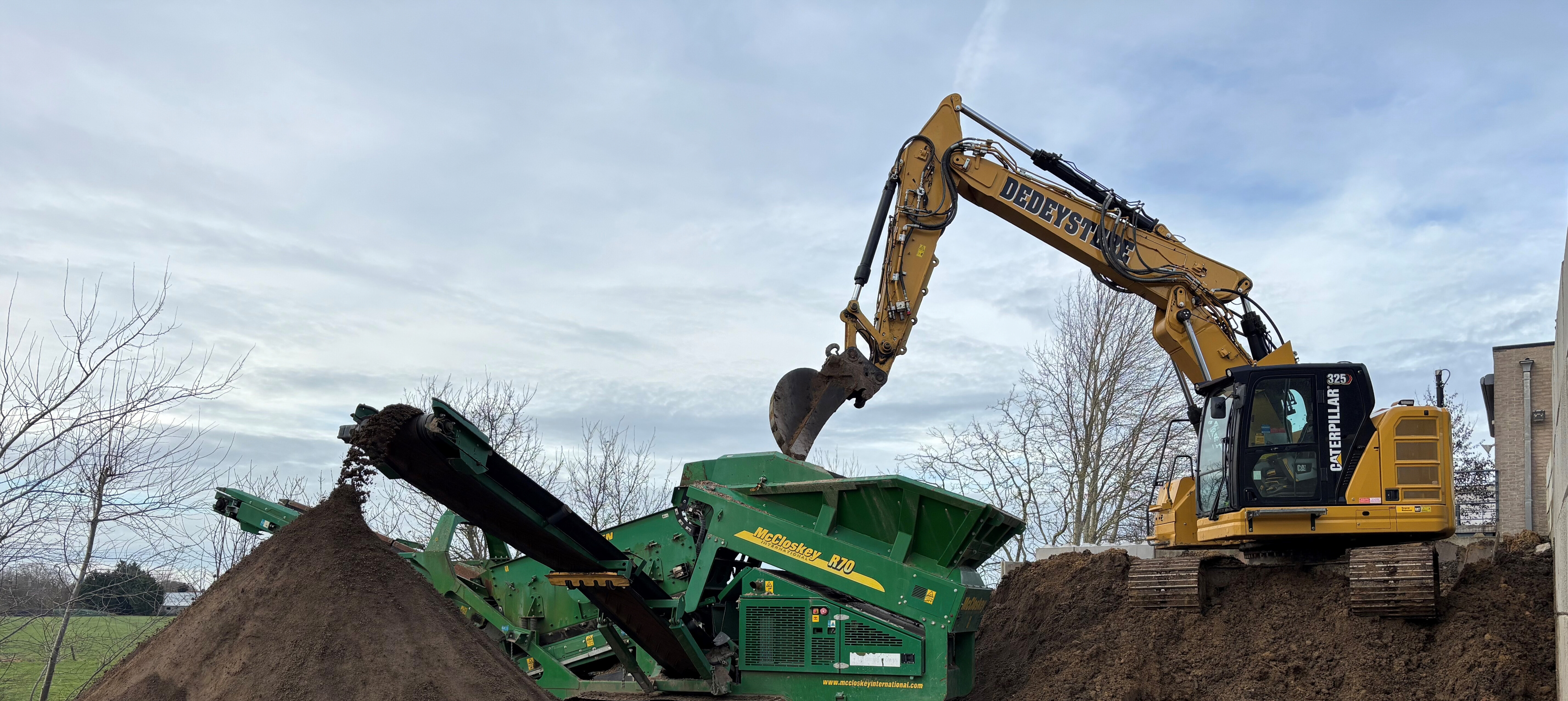 Zeefwerken met eigen zeefmachine. Hierbij wordt de grond gemengd met stenen gesplitst in zuiver grond en zuiver steenpuin.